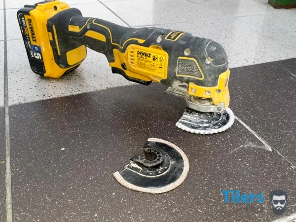 Once you have removed the grout from one section, carry on and remove all the grout from around the cracked and broken tile.