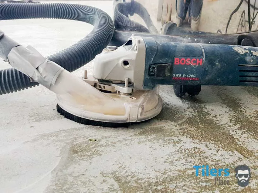 4. For highly polished concrete floors, mechanical scarring may be needed in order for the tile primer to penetrate it. Use an angle grinder with a diamond grinding wheel to scuff up the surface.